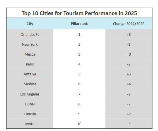 Orlando umumiy sayyohlik faolligi bo‘yicha Nyu-York shahridan o‘zib ketdi. Ushbu o‘sish ichki turizmning o‘sishi, Epic Universe ochilishi, SeaWorld va Disney World’dagi ta’mirlash ishlari va FIFA klublar o‘rtasidagi Jahon chempionati o‘yinlariga mezbonlik qilish bilan bog‘liq.