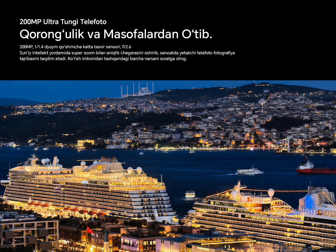 HONOR Magic8 Pro bugungi kunda sanoatdagi eng ilg‘or AI telefoto tizimini taqdim etadi. U 200 MP Ultra Tungi Telephoto kamerasiga ega bo‘lib, 1/1.4 dyuymli katta sensor, f/2.6 keng diafragma, OIS (optik stabilizasiya) va 3.7x optik zum bilan jihozlangan. Ushbu tizim yorug‘lik qabul qilishni keskin yaxshilab, hatto uzoq masofalarda ham o‘ta aniq detallarni taqdim etadi. 50 MP Ultra Tungi Asosiy Kamera (f/1.6, OIS) va 50 MP Ultra Keng Kamera (122°, 2.5 sm HD makro) esa ranglarning yorqinligi, tabiiy portretlar va keng ko‘lamli peyzajlar bilan ijodiy imkoniyatlarni yanada kengaytiradi.
