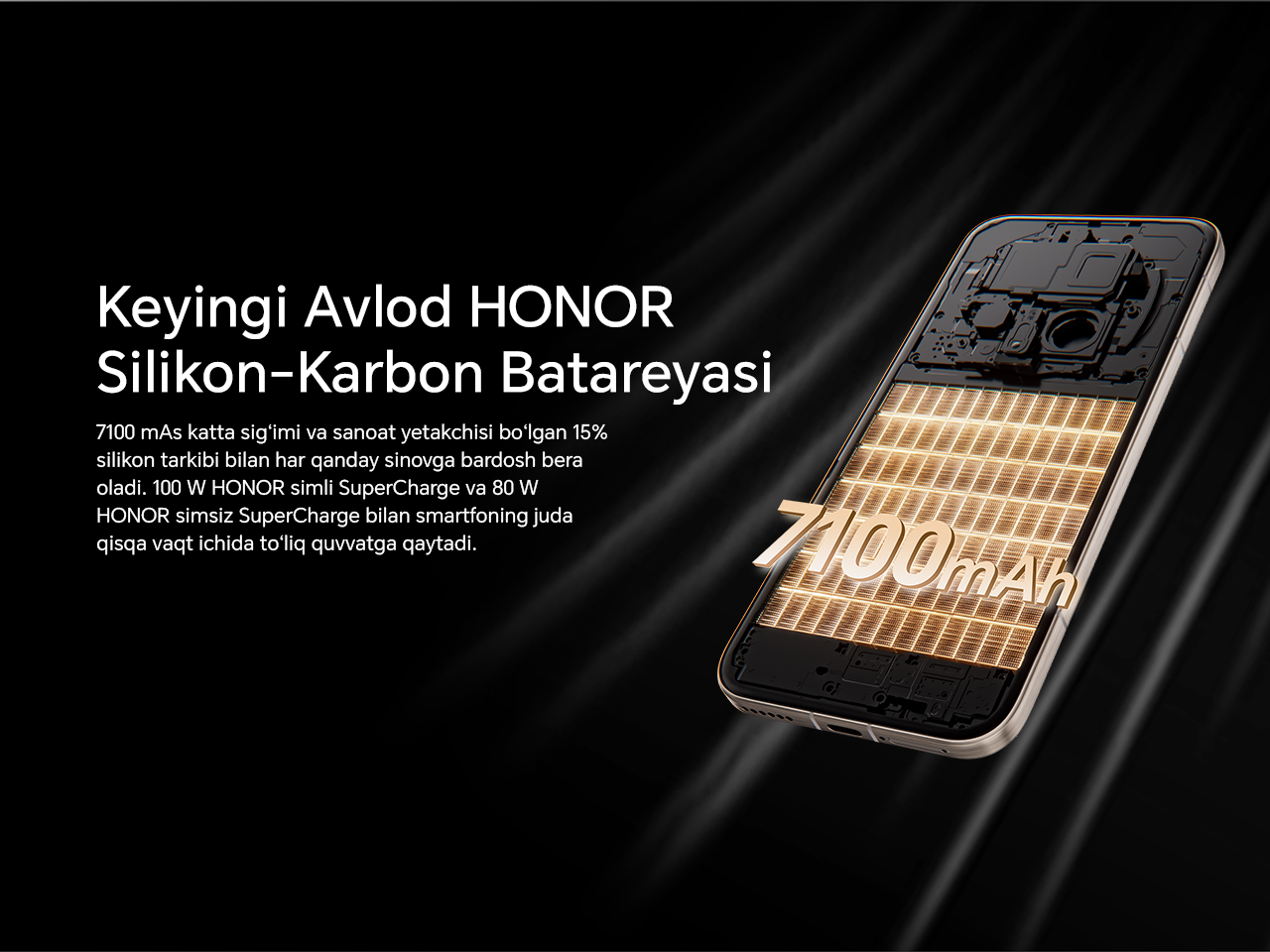 Smartfonning 7,100 mA/soat hajmli kremniy-uglerodli batareyasi kun bo‘yi quvvat bilan ta’minlaydi, 100W simli va 80W simsiz HONOR Super Charge esa quvvatni o‘ta tez tiklash imkonini beradi. 6,71 dyuymli LTPO OLED displey 1–120 Gs chastota va 6,000 nits gacha maksimal yorqinlikni qo‘llab-quvvatlaydi. Ko‘z salomatligi uchun esa 4320 Hz PWM Dimming texnologiyasi joriy etilgan.
